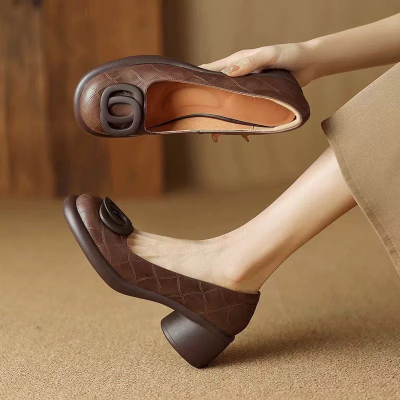5CM Soft Sole Retro Thick Heel Round-toed Leather Shoes